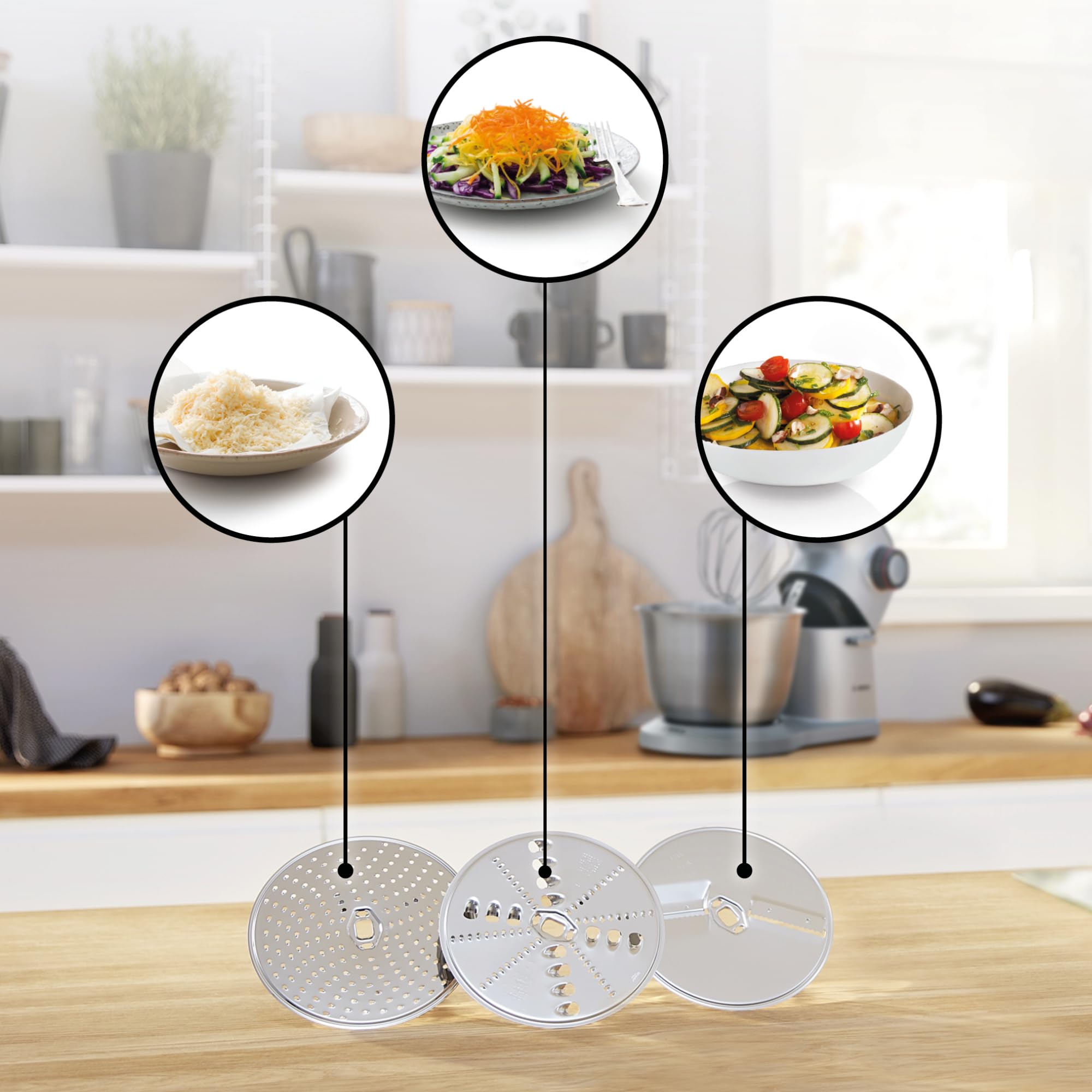 • Vielseitig einsetzbar mit Patisserie-Set (Schlagbesen, Rührbesen, Knethaken), Durchlaufschnitzler mit drei Scheiben zum Raspeln, Reiben, Schneiden, zusätzlich Mix-Aufsatz, Zitruspresse und Fleischwolf